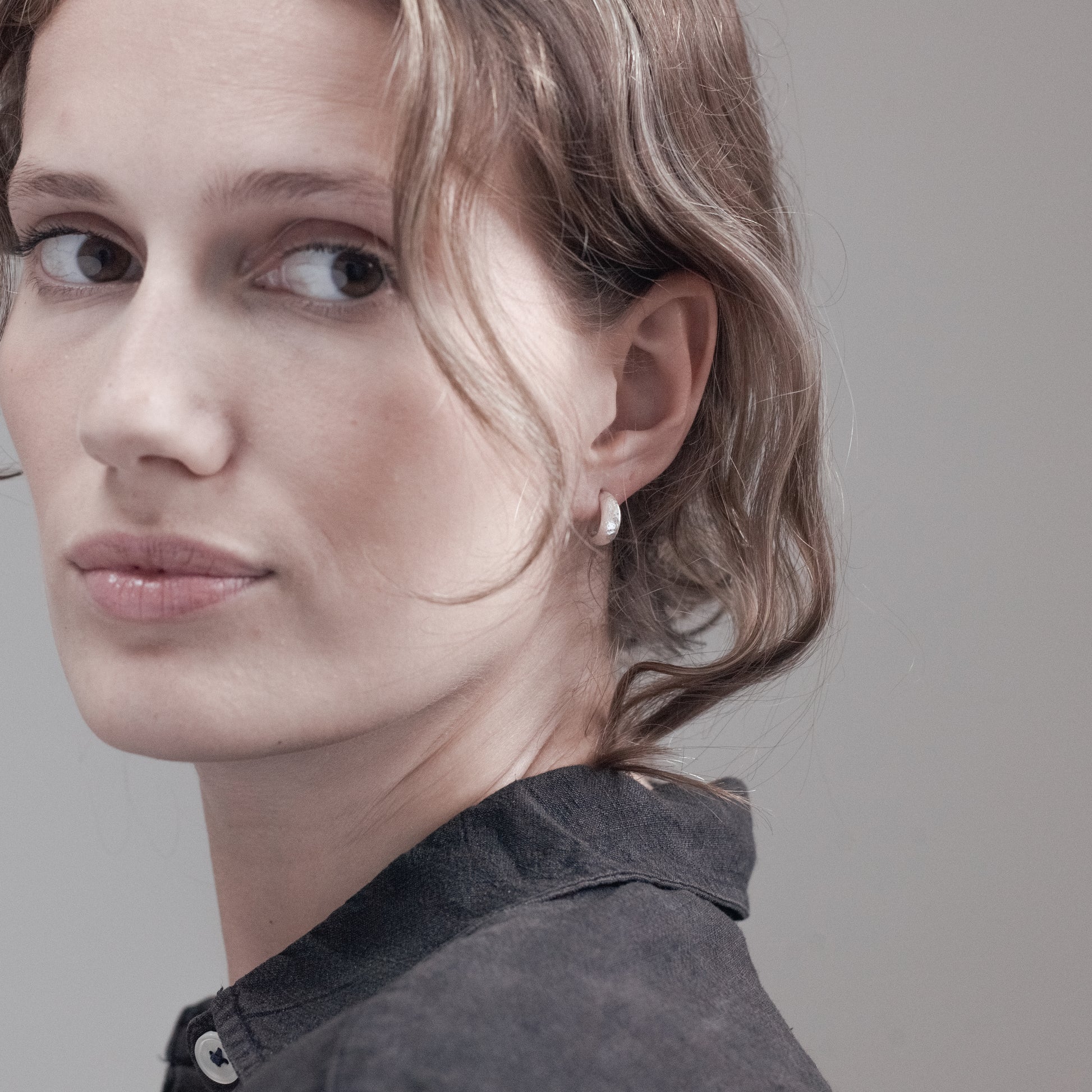 Easy to wear but impactful silver open hoop earrings that hug close to the lobe. The half moon form bellies gently out to a ridge running around the centre of the curve and tapers at both ends.