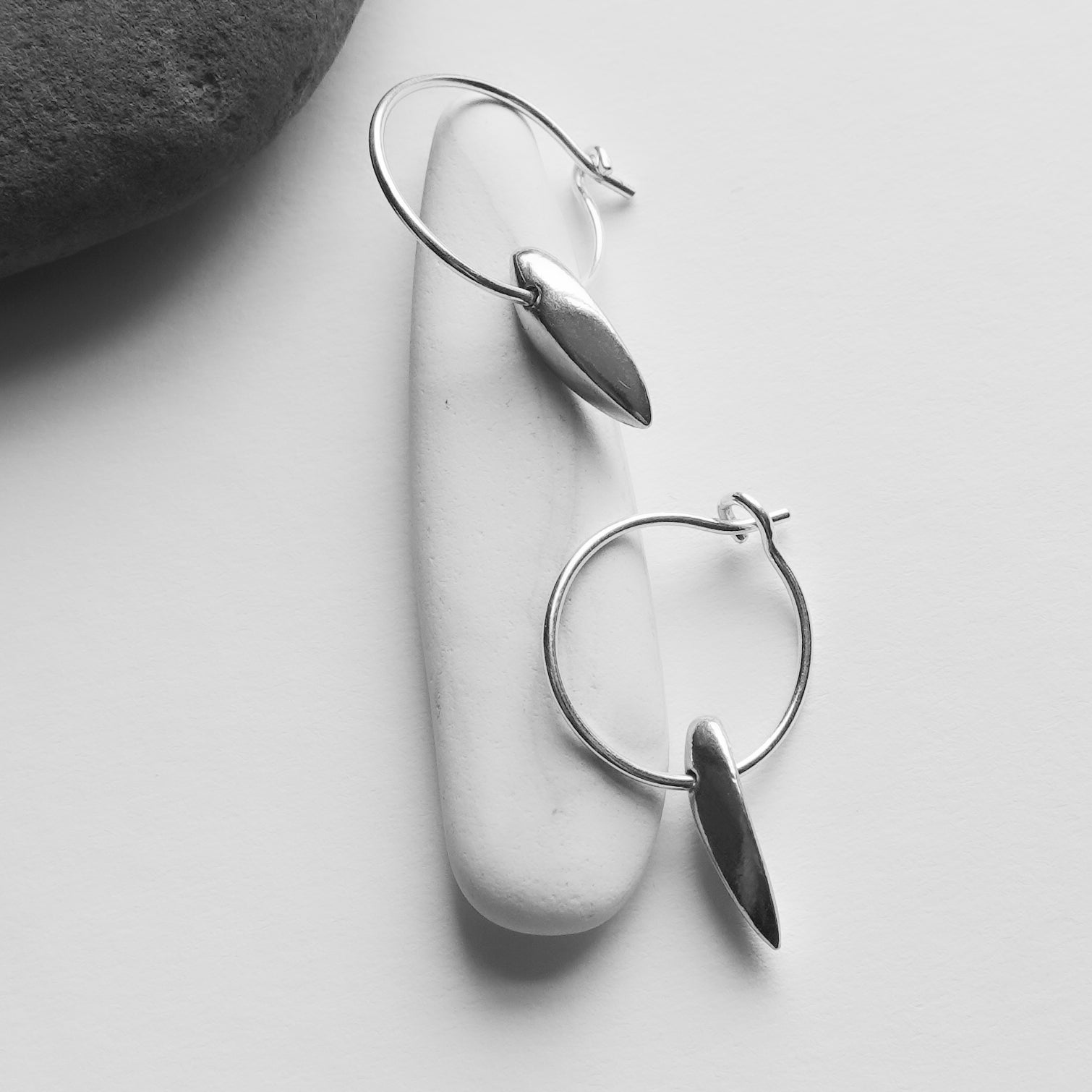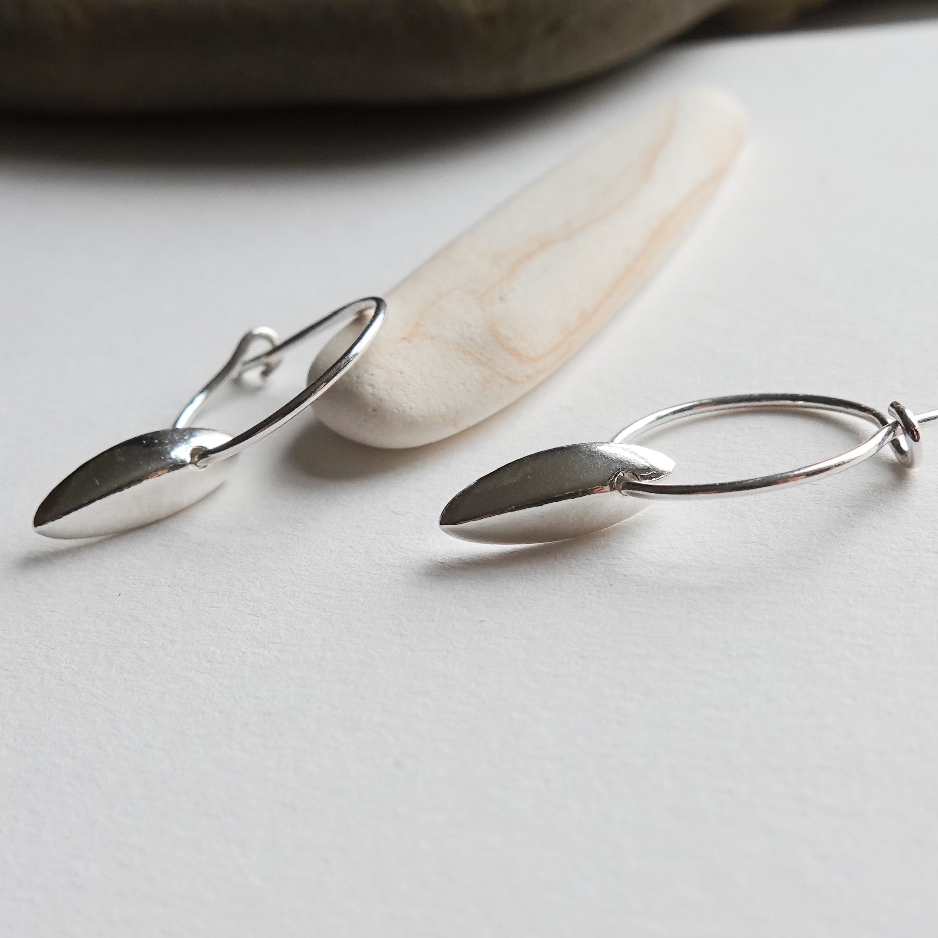 Silver sculptural seed forms with an elongated subtly curved profile hang from handmade gently planished hoops. Finished to a high shine the light washes over the seeds, highlighting the ridge running down the centre.