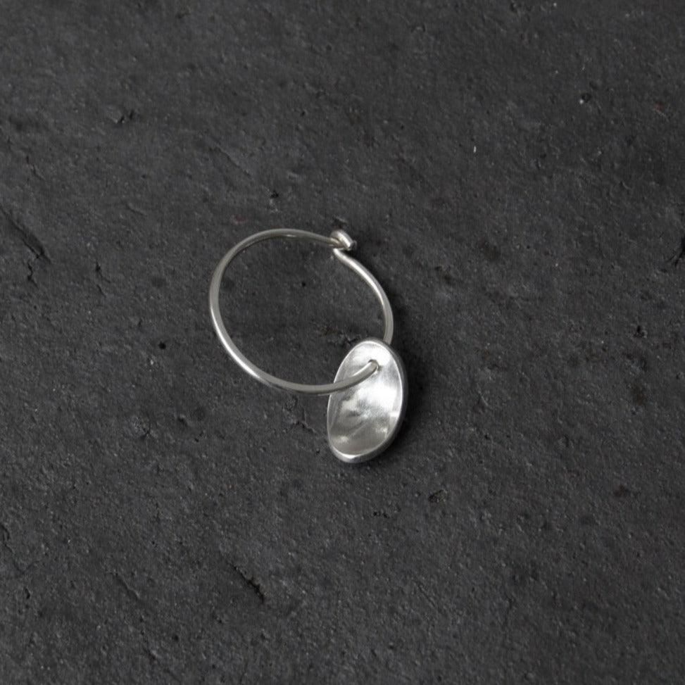 Pretty domed smooth and shiny silver pod that threads onto a gently planished silver hoop.